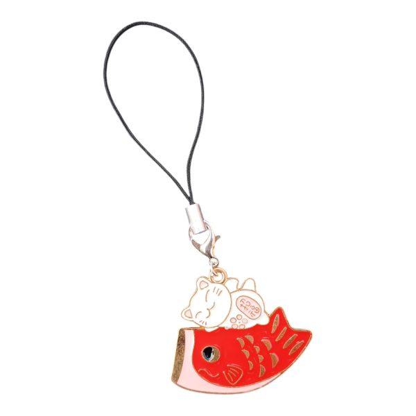 Lucky Cat and Red Fish Phone Charm, Decorative Mobile Strap, Metal Keychain