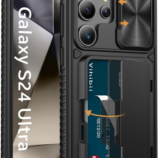 Vihibii for Samsung Galaxy S24 Ultra Back Cover with Card Holder (4 Cards) & Slide Camera Cover & Kickstand, Rugged Hard Back & TPU Soft Edge Case for Galaxy S24 Ultra 5G 6.8″ 2024, Black