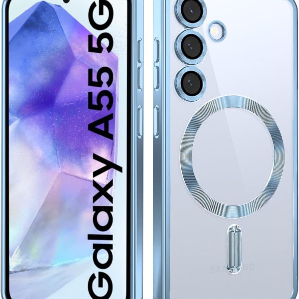 VONZEE Clear Logo Electroplating Transparent Case for Samsung A55 5G, Magnetic Plating [Support for MagSafe Charger] Electroplate TPU Cover, Individual Camera Protection for Each Lens – Sierra Blue