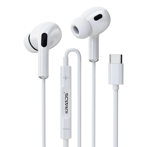Kratos Type C Headphones with Mic, White in-Ear Design, 12mm Driver for Deep Bass and Clear Sound, C Type Earphones Wired, Compatible with iPhone, Android Smartphones, Tablets, and USB C Devices